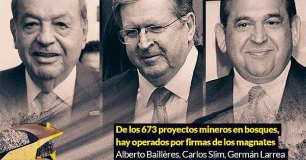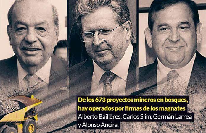 Los 673 proyectos mineros (44 por ciento del total) que se encuentran en bosques y selvas sin consulta previas e informadas a las comunidades son en su mayoría operados por mineras canadienses, pero también hay compañías de los magnates Alberto Baillères (Peñoles), Carlos Slim (Grupo Frisco), Germán Larrea (Grupo México) y Alonso Ancira (Altos Hornos de México), documenta el informe “Bosques comunitarios y minería en México” del Consejo Civil Mexicano para la Silvicultura Sostenible (CCMSS).