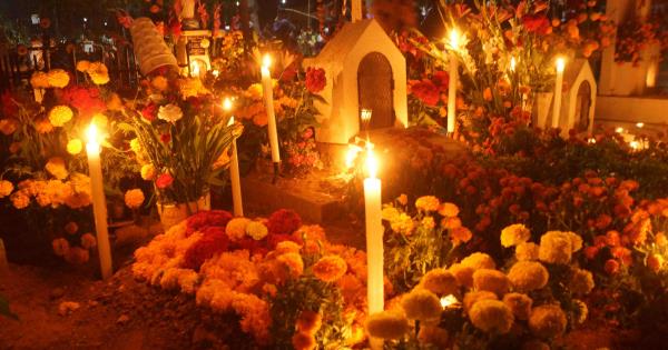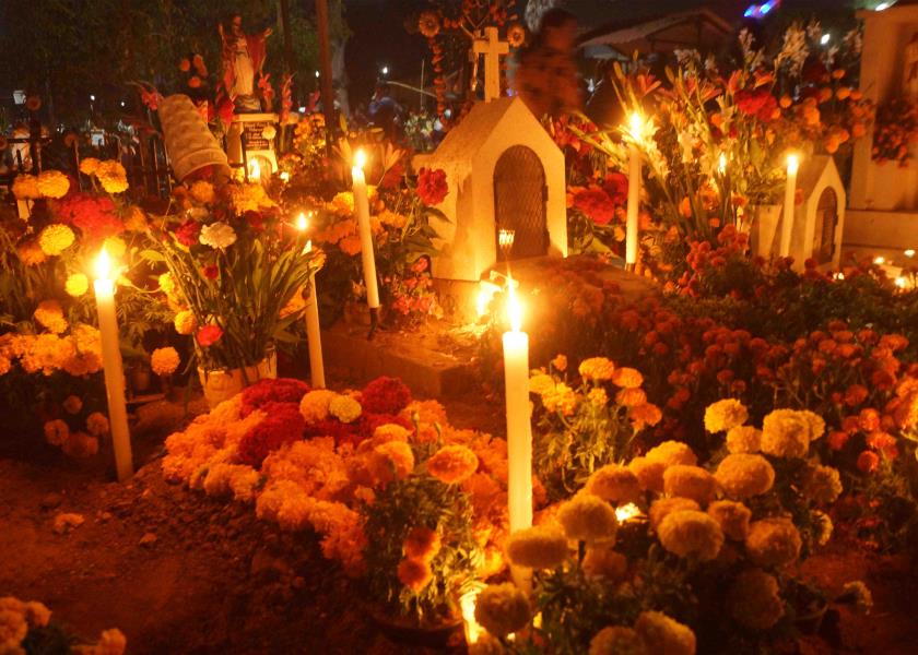 El pueblo se adorna con flores de cempasúchil y las tumbas se iluminan con el afán de guiar a los muertos que visitan el mundo de los vivos el 1 y 2 de noviembre.