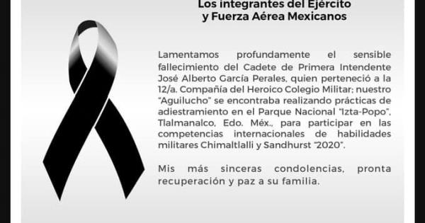 A través de su cuenta de Twitter, el general señaló que el cadete de Primera Intendente, José Alberto García Perales, "Aguilucho", quien perteneció a la 12/a Compañía del Heroico Colegio Militar, iba a participar en las competencias internacionales de habilidades militares Chimaltlalli y Sandhurts 2020.