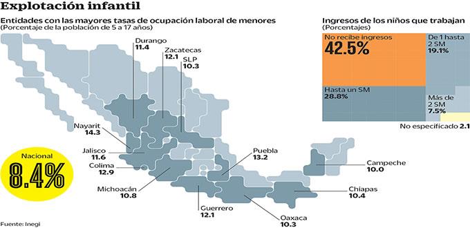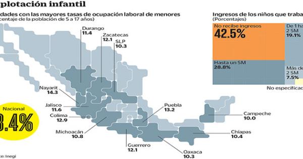 Entre los estados con mayores tasas de ocupación laboral infantil destaca Nayarit, donde 14.3% de los niños realiza alguna labor productiva; le siguen en orden de población con este estatus Puebla, con 13.2%; Colima, 12.9%; Zacatecas y Guerrero, 12.1% cada una; Jalisco, 11.6%; Durango, 11.4%; mientras que Michoacán, Chiapas, Oaxaca; San Luis Potosí y Campeche tienen niveles superiores a 10%, aunque menores a 11%.