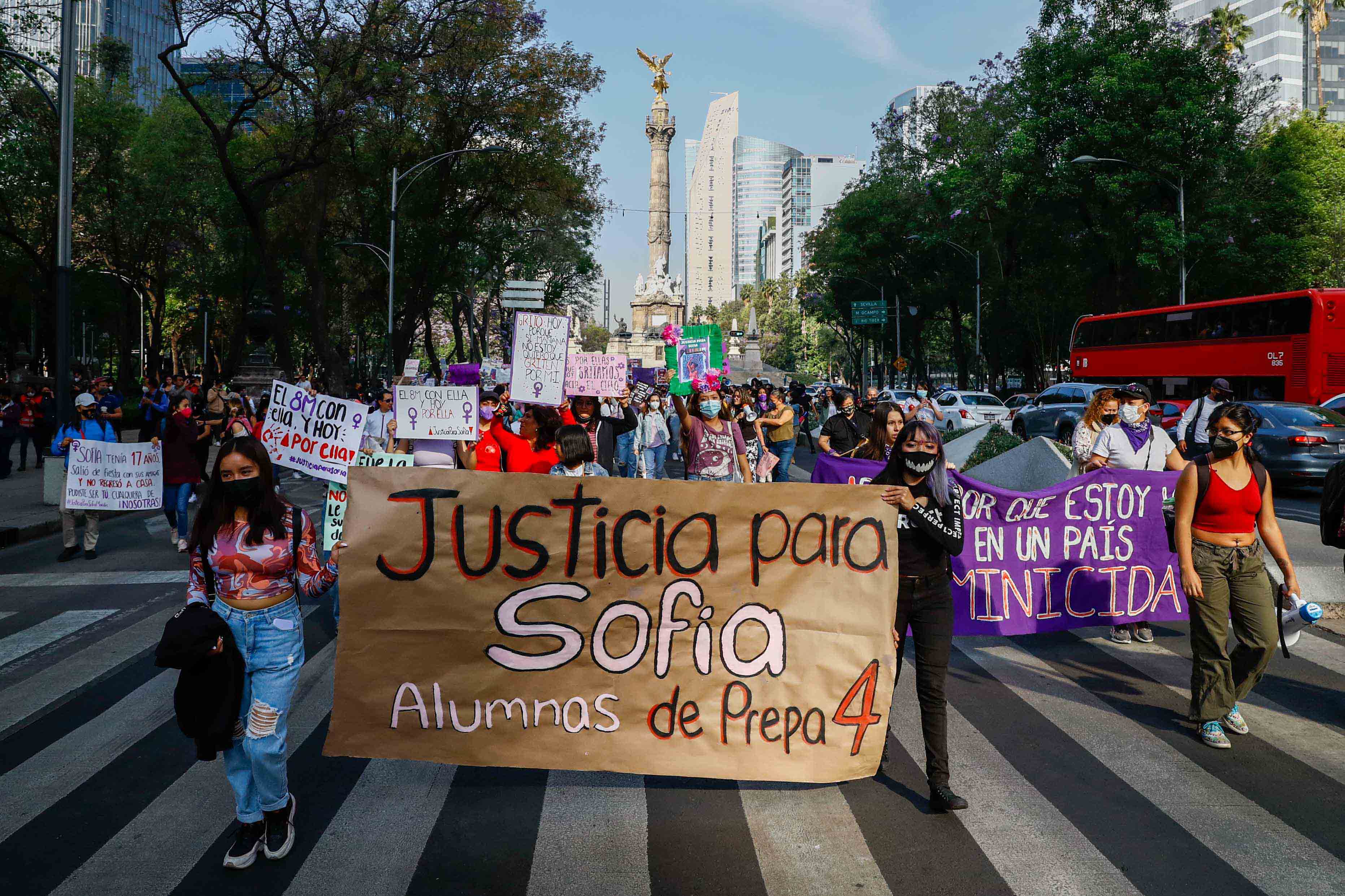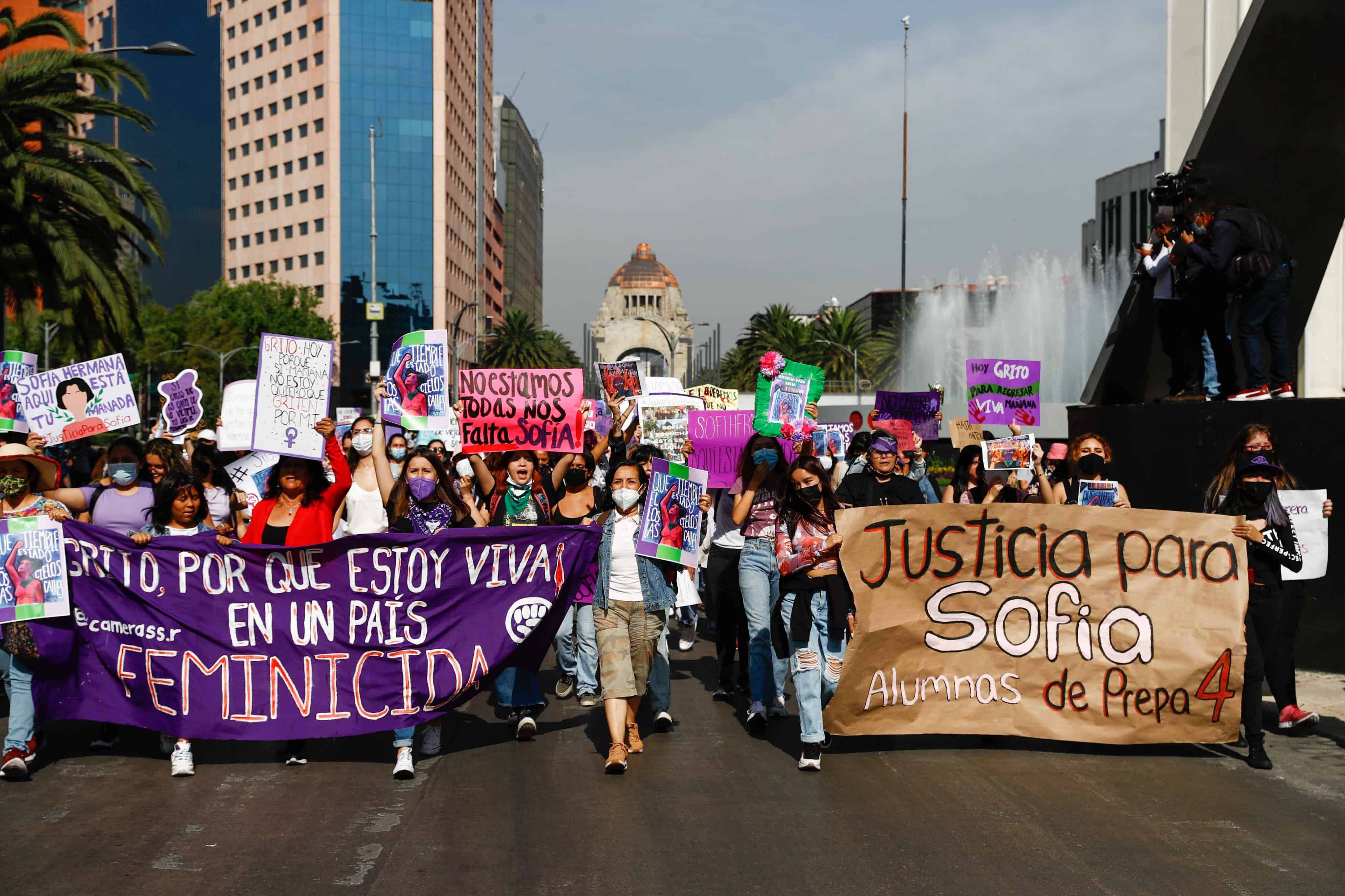 CIUDAD DE MÉXICO, abril 13 (EL UNIVERSAL).- Familiares de Sofía y colectivos de mujeres marcharon del Paseo de la Reforma a la plancha del Zócalo capitalino, en donde protestaron por el feminicidio de la estudiante de la Prepa 4 de la UNAM.