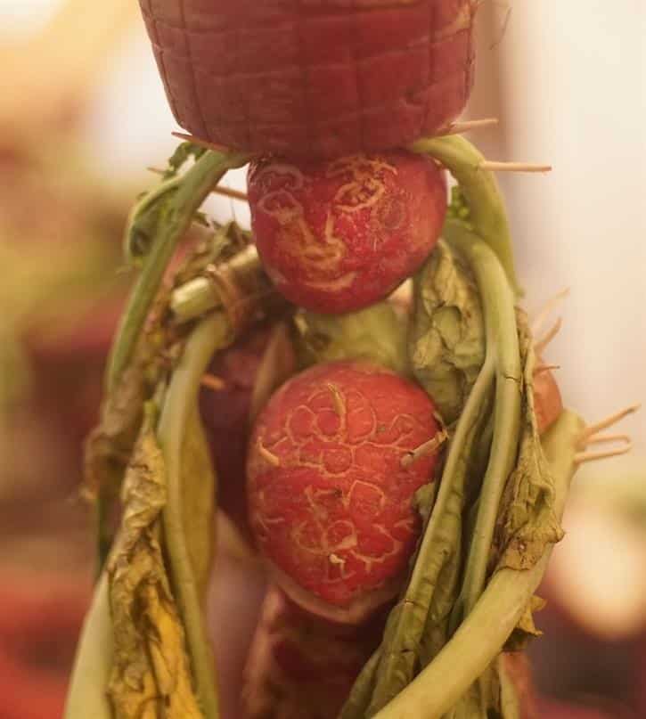 Los rábanos fueron cosechados la mañana del 19 de diciembre y fueron utilizadas para dar vida nuevamente a esta singular costumbre navideña por 60 artesanos más de 16 toneladas, que fueron desenterradas por los mismos artesanos que esta noche les dieron vida, textura y forma.