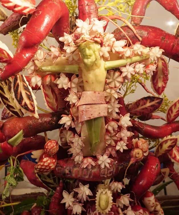 Para terminar su creación fueron necesarios tres días, para representar en un nacimiento oaxaqueño las figuras religiosas de San José, María y Jesús tallados en rábanos.