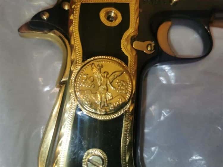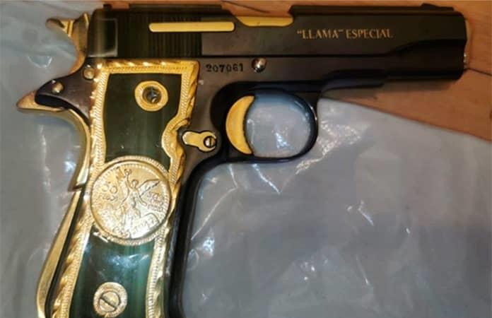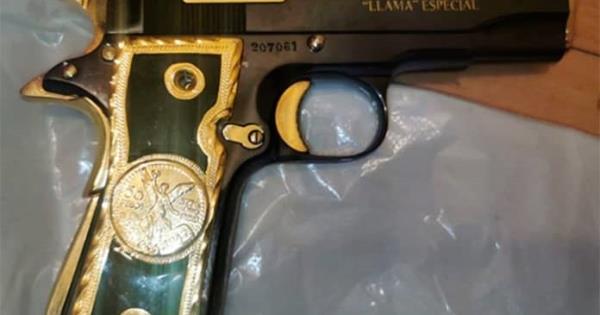 La pistola, una Llama .380 calibre 9mm, de acuerdo con una ficha informativa de la corporación, es negra con dorado “con lo que parece ser chapa de oro”, tiene lo que aparente ser un centenario incrustado. Su origen es español.