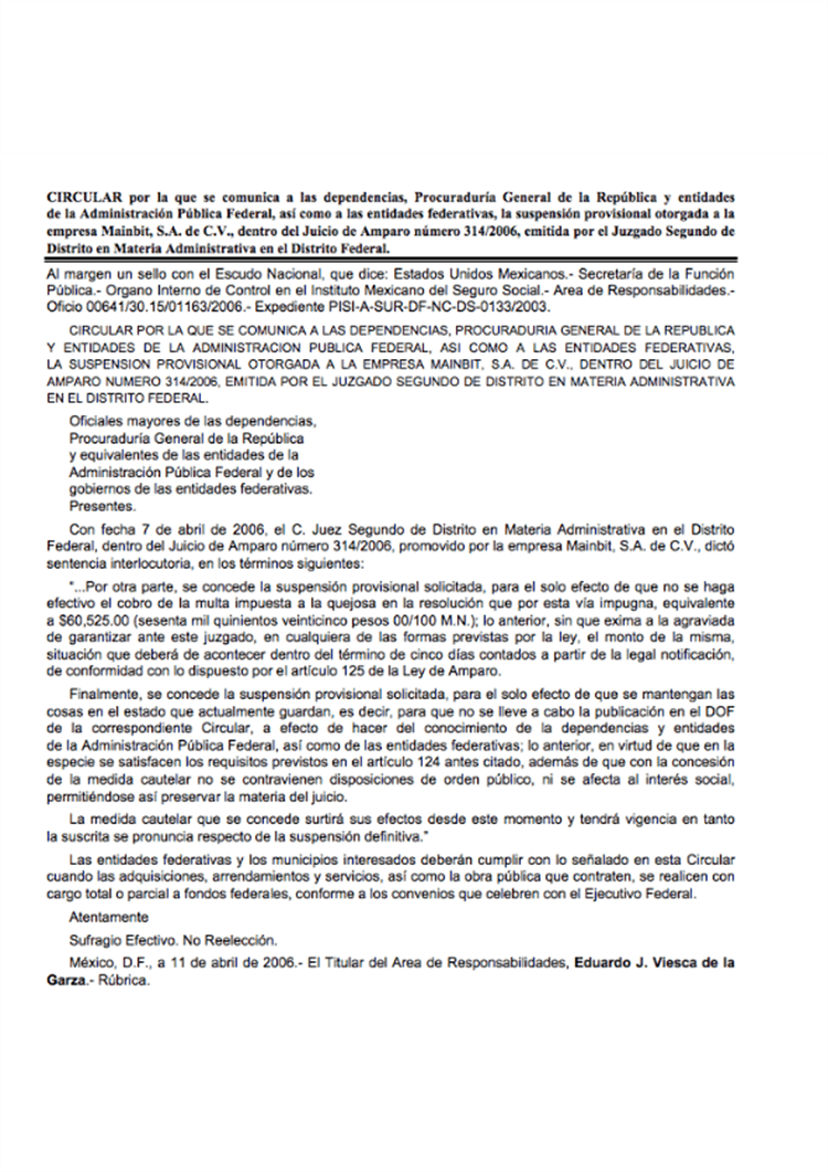 De acuerdo con el Diario Oficial de la Federación (DOF) del 22 de marzo de 2006, la compañía fue inhabilitada por tres meses debido a incumplimientos contractuales y sancionada con una multa por 65 mil 525 pesos de aquella época. Pese al proceso de inhabilitación, Mainbit se amparó y logró que un juzgado local suspendiera la multa de manera temporal, en lo que su situación legal y administrativa era esclarecida, tal y como consta en el juicio de amparo número 314/2006.