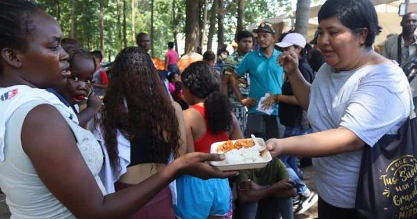 La representante explicó que en el campamento ubicado en la comunidad Viva México se entregaron 350 platos de comida para migrantes venezolanos, colombianos, haitianos, africanos y de otros países.