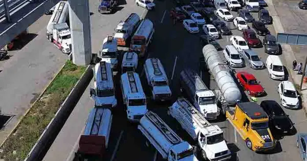 Ciudad de México.- Operadores de camiones cisterna que se dedican al transporte de agua en el Estado de México, vecino a la capital, cerraron avenidas en varios municipios de la entidad en protesta por la intervención de más de 160 pozos y tomas de agua relacionados con la extracción, sobreexplotación, distribución, acaparamiento y venta ilegal del vital líquido.