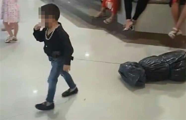 En un video se observa a un niño vestido como supuesto sicario jalando un bulto envuelto en una bolsa negra mientras pide "calaverita". El menor va acompañado de varias mujeres en lo que parece ser un centro comercial.