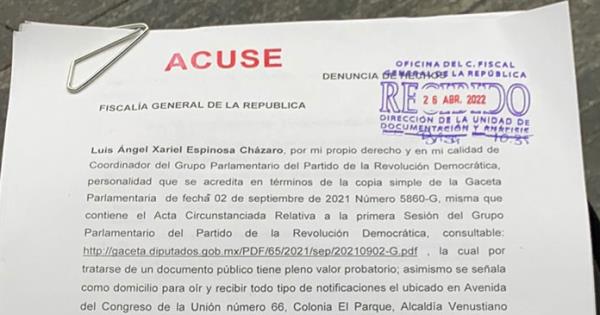 CIUDAD DE MÉXICO, abril 26 (EL UNIVERSAL).- El coordinador del PRD en la Cámara de Diputados, Luis Espinosa Cházaro, denunció ante la Fiscalía General de la República (FGR) el hackeo de la cuenta oficial de su bancada en Twitter, en la que la semana pasada se acusó a sus legisladores de recibir dinero a cambio de rechazar la reforma eléctrica.