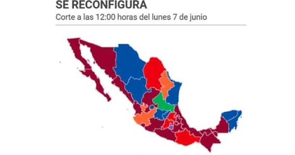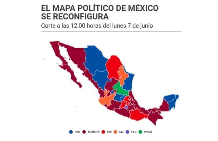 Luego de los resultados electorales de la jornada del 6 de junio, el mapa político de México se reconfiguró. Para este año, Morena gobernaría un total de 16 entidades, la mitad del país, y Acción Nacional (PAN) será la segunda fuerza con ocho entidades, según los datos proporcionados por el Programa de Resultados Electorales Preliminares del Proceso Federal.