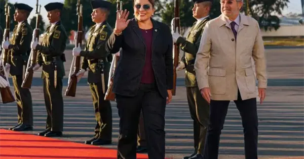La Presidenta de Honduras fue recibida con los honores oficiales correspondientes a una visita de Estado, con protocolo diplomático y la interpretación de los himnos nacionales, para posteriormente dar paso a los encuentros cerrados entre las delegaciones.