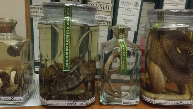 Durante un Operativo de Vigilancia para la Protección de Especies Silvestres en Oaxaca, personal de la Procuraduría Federal de Protección al Ambiente (Profepa) aseguró 18 especímenes de reptiles y arácnidos que se encontraban al interior de botellas de mezcal de diferentes capacidades.