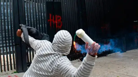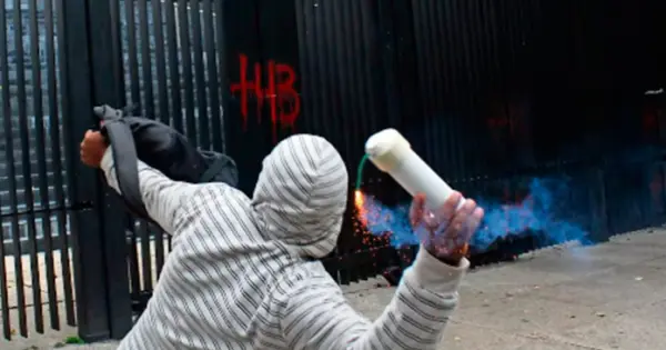 Protesta de normalistas de Ayotzinapa con lanzamiento de petardos