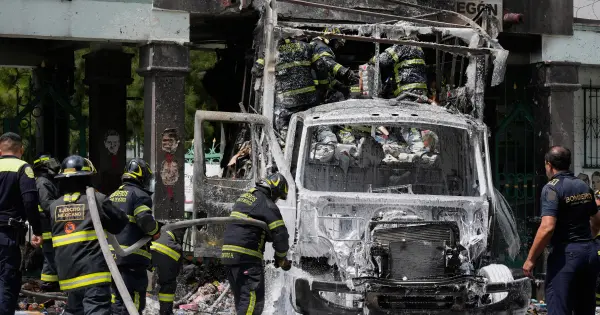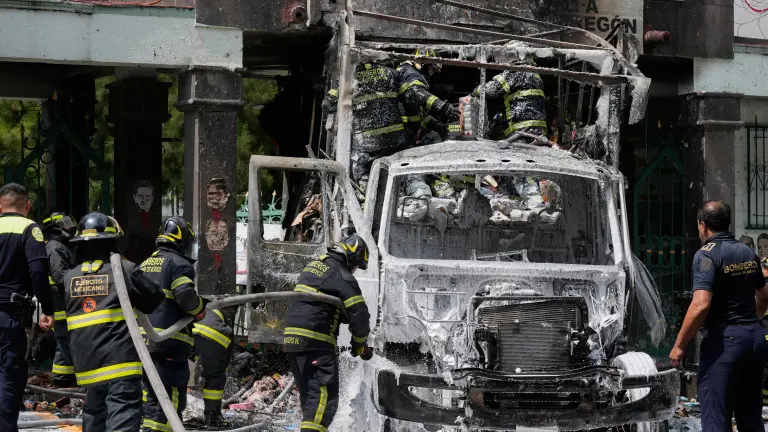CIUDAD DE MÉXICO (AP) — En la víspera de un nuevo aniversario de la desaparición de los 43 estudiantes de la Normal Rural de Ayotzinapa en 2014, padres de las víctimas y alumnos de la escuela de magisterio situada en el sur de México protagonizaron el jueves una protesta ante una base militar de Ciudad de México que acabó con un camión ancajado en una de sus puertas y luego incendiado.