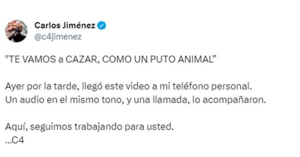 Ayer miércoles, Jiménez reveló que recibió un video en el que hombres encapuchados lo amenazan de muerte. "Te vamos a cazar como un animal", le dijeron. Tras recibir dicho mensaje, el periodista aseguró que "somos más los buenos".