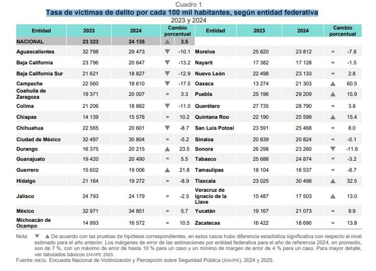 En 2024, el número de víctimas de delitos de 18 años y más fue de 23.1 millones de personas en México, equivalente a una tasa de 24 mil 135 víctimas por cada 100 mil habitantes (prevalencia delictiva), cifra 3.5% superior a las 23 mil 323 reportadas en 2023, con lo que liga dos años al alza.