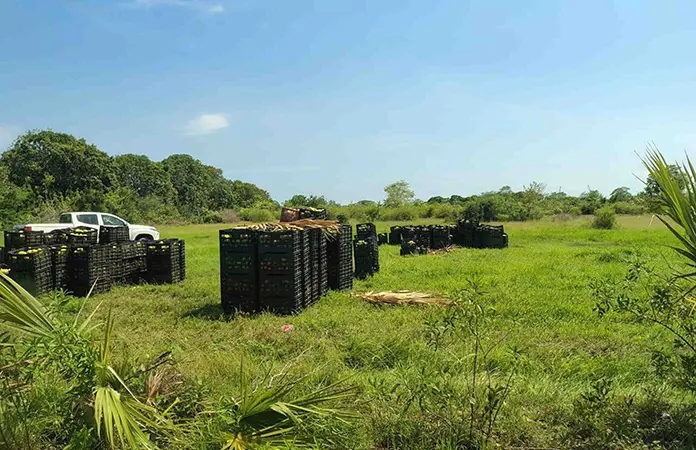 Ella portaba un chaleco guinda y al llegar a la puerta se identificó como Brenda Elizabeth Meza Sandoval, funcionaria de la Secretaría de Bienestar: "Venimos por los mangos", dijo.