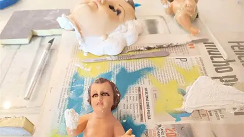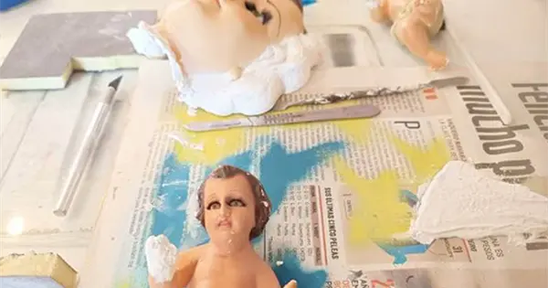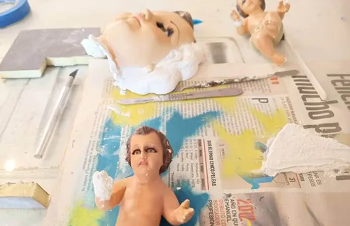 En su taller particular, siempre hay al menos una de estas figuras esperando atención. No importa si es diciembre o pleno verano: un dedito roto, una grieta en el rostro o un accidente de último momento convierten su espacio en una suerte de sala de urgencias devocional.