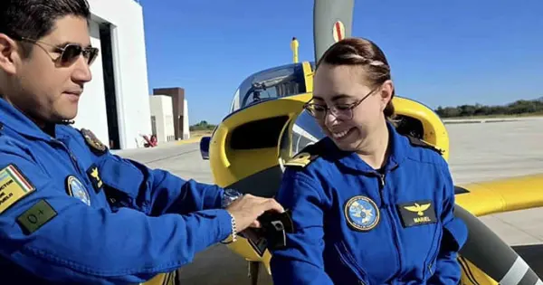 Ciudad de México.- La teniente de fragata del servicio de Aeronáutica Naval Piloto Aviador Mariel Sánchez Martínez se convirtió en la primera mujer instructora de vuelo en concluir el curso Calificación como Instructora de Avión, en las instalaciones de la Escuela de Aviación Naval en La Paz, Baja California Sur, informó la Secretaría de Marina (Semar).