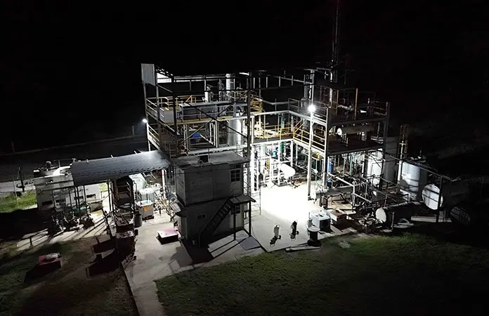 La minirrefinería está compuesta por una estructura metálica de tres pisos, con tubos casi semioxidados, reactores en la parte baja, media y alta, y un cuarto de control de máquinas para el proceso para la elaboración de aditivos de combustible.