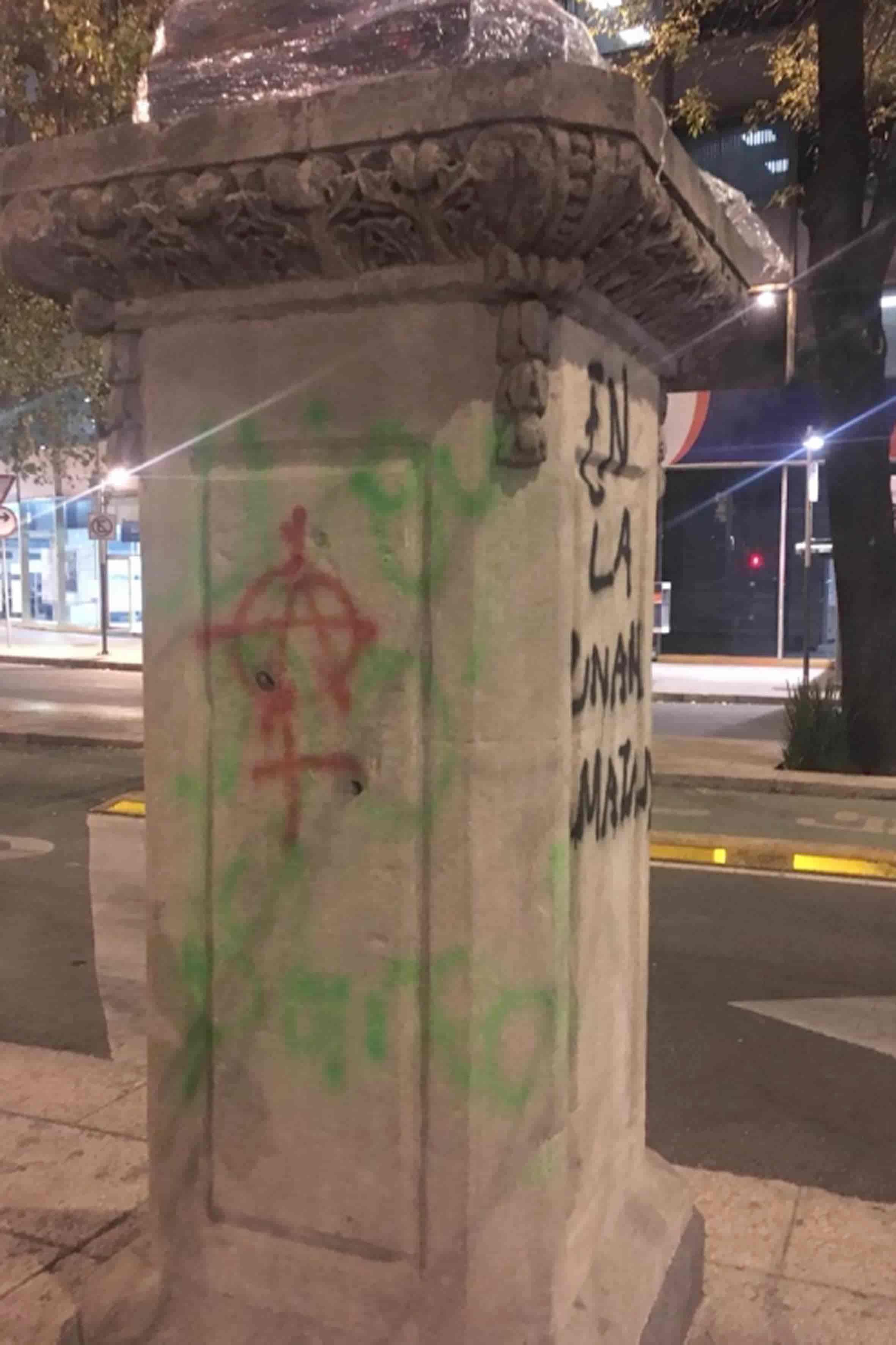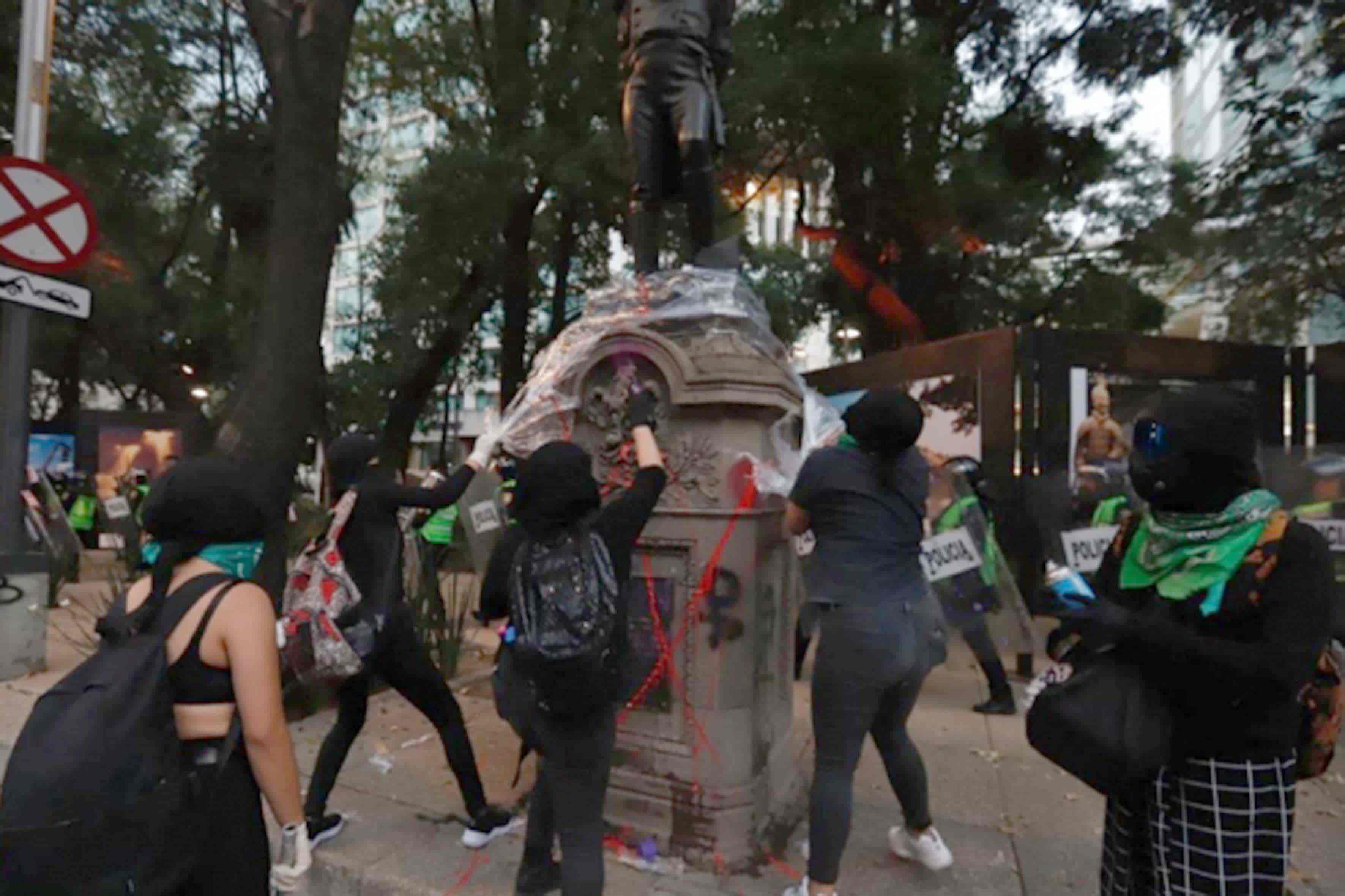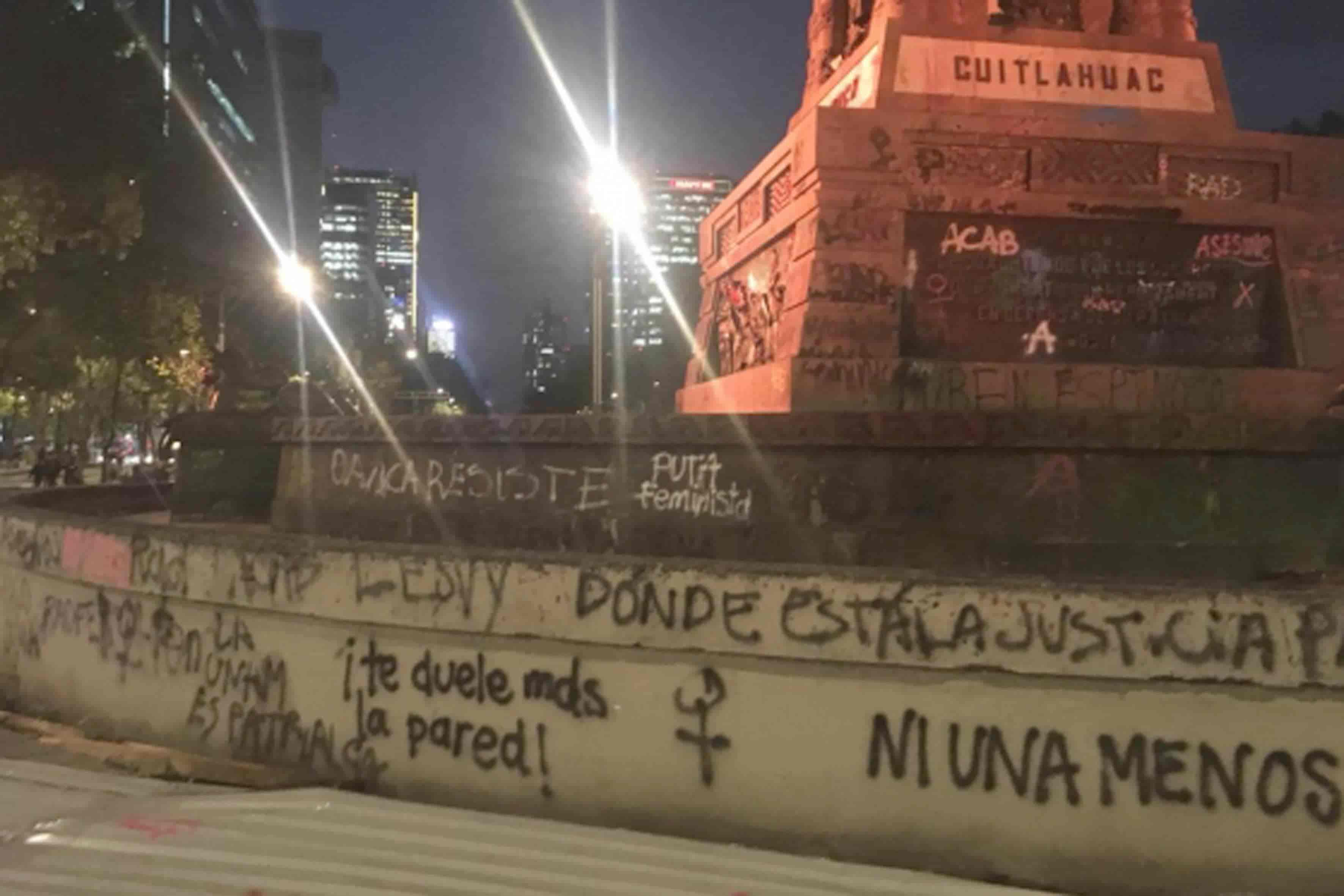 Otro grupo retiró las láminas colocadas para proteger el Monumento a Cuauhtémoc, en el cruce de Insurgentes y Paseo de la Reforma, realizaron pintas y prendieron fuego.