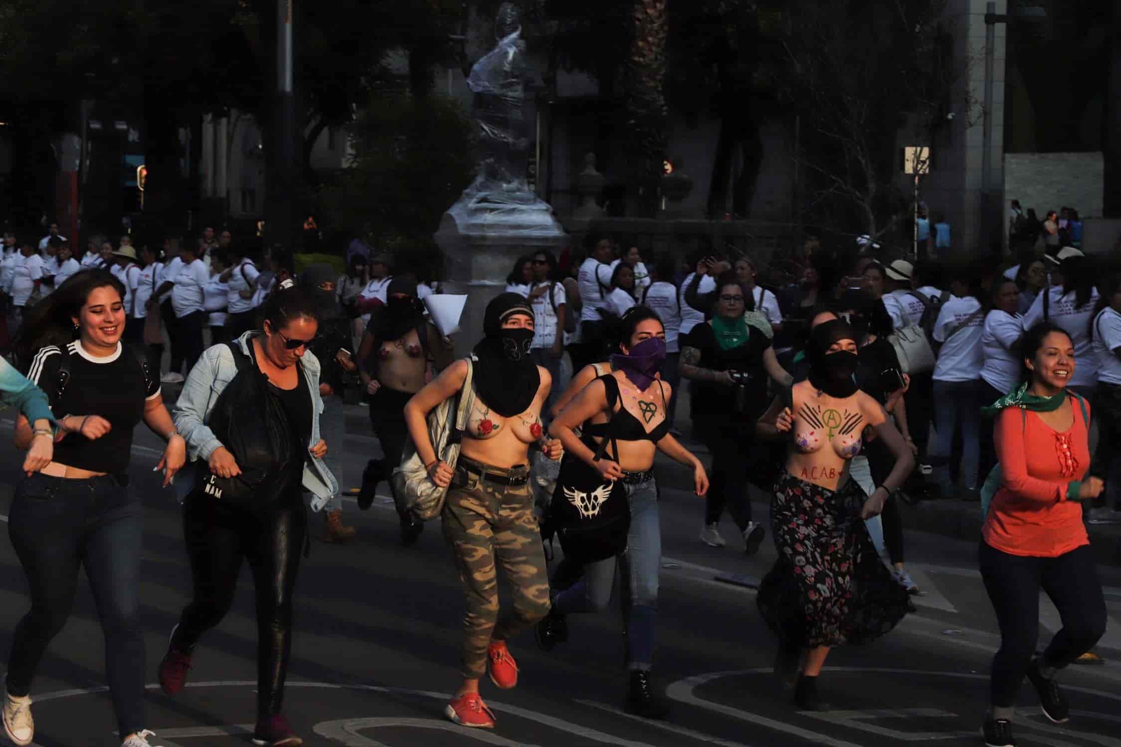 Entre la movilización es posible identificar a integrantes de colectivos convencidas de sus peticiones y participación, que marchan de manera pacífica, pero algunos grupos de mujeres, en su mayoría jóvenes, portan aerosoles y al grito de "podemos ser peores", avanzan de manera intempestiva y a la vanguardia del grupo.