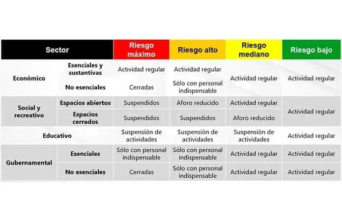 Como el semáforo está en rojo, la máxima alerta sanitaria, las únicas actividades que pueden realizarse son las esenciales del sector salud, seguridad, alimentación, minería, construcción y fabricación de equipos de transportes, con medidas de higiene: uso de cubrebocas en transporte público y lugares con aglomeraciones de personas; gel antibacterial y lavado frecuente de manos; sana Distancia entre las personas; estornudo de etiqueta; limpieza y desinfección constante de espacios de trabajo y en el hogar; y evitar saludarse de mano o con beso.