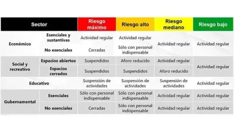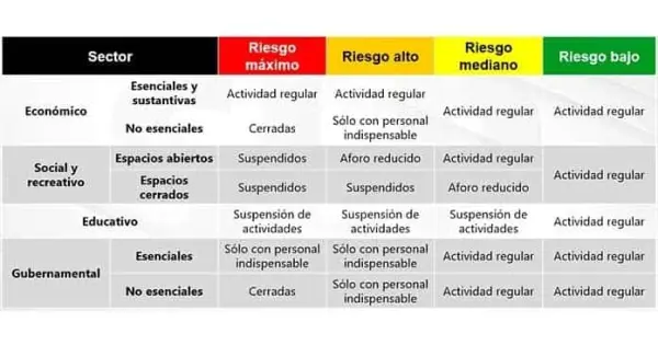 Para cuidar la salud de los niños, jóvenes y maestros, las escuelas, públicas y privadas, deberán mantener sus actividades de manera no presencial. Cuando se llegue al Semáforo Naranaja, se retomarán actividades del gobierno, industrias manufactureras; comercio al por mayor y al por menor; espacios de venta de alimentos preparados; servicio de hospedaje al público en general; centros y plazas comerciales solo con aforo que permita garantizar la sana distancia sin exceder un máximo del 30 por ciento.