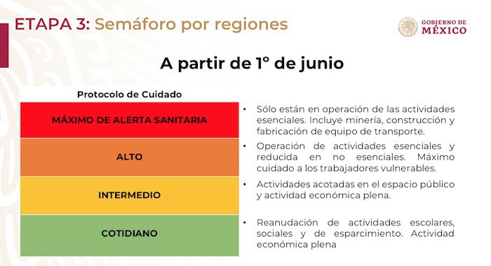 Las medidas de seguridad sanitaria pasan ahora a la vigilancia por parte de las 32 entidades, y cada semana de acuerdo a su nivel de riesgo serán notificadas por la autoridad sanitaria federal cuál es su nivel de riesgo (por número de casos y porcentaje de ocupación hospitalaria), cuál es el conjunto de actividades que corresponden con ese color del semáforo y los Gobiernos estatales serán responsables de establecer las aperturas correspondientes de las actividades que cumplan los criterios de valor social y de cantidad de personas en la vía pública.