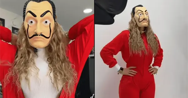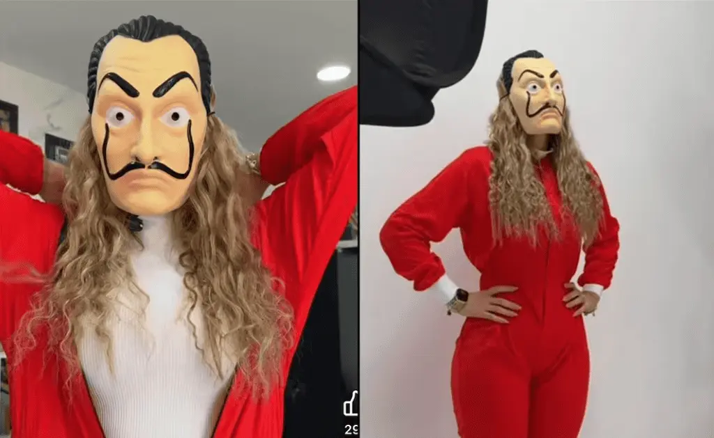 Leylany Richard decidió ponerse el mono rojo que usaron los personajes de la serie española de Netflix para llegar a la oficina de comunicación social de Atizapán de Zaragoza, donde le esperaban para tomar las fotografías y una vez ahí, se colocó la máscara de Salvador Dalí.