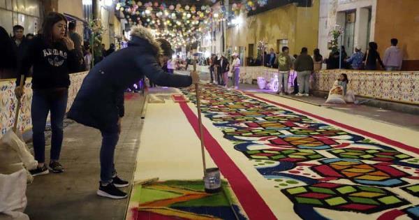 Tapetes de aserrín de hasta 100 metros se despliegan en calles de Huamantla