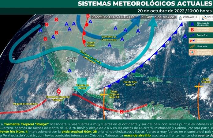 El pronóstico prevé que durante las próximas horas las bandas nubosas de Roslyn ocasionarán lluvias "puntuales intensas", de 75 a 150 milímetros, en regiones del estado Guerrero.