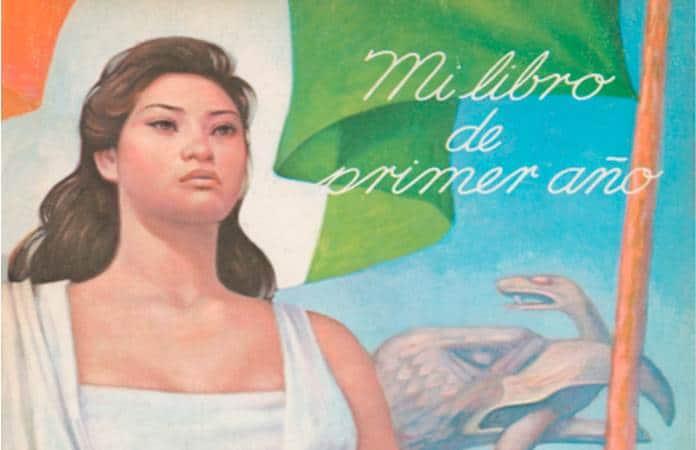 La primera generación de libros de texto gratuitos tuvieron en la portada los rostros de Miguel Hidalgo, Benito Juárez y Francisco I. Madero. En 1962 apareció impresa en los ejemplares una de las estampas más conocidas por los mexicanos: La Patria, del pintor Jorge González Camarena. La imponente mujer morena vestida de blanco con la bandera en la mano izquierda es sin duda el sinónimo de la Comisión Nacional de Libros de Textos Gratuitos.