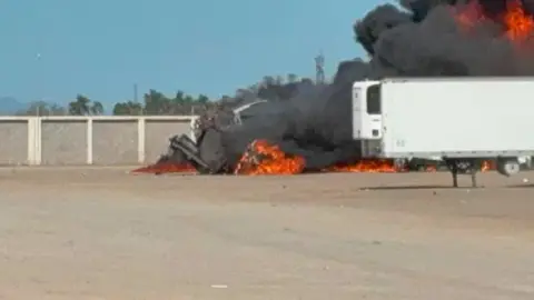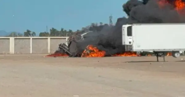 El fuego que abarcó varias cajas de tráiler estacionadas en esa zona, generó una enorme nuble negra que se podía observar desde varios puntos de la ciudad de Los Mochis, por lo que los cuerpos de auxilio y de seguridad, cerraron en forma temporal uno de los carriles de circulación de la carretera México-Nogales.