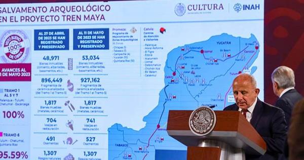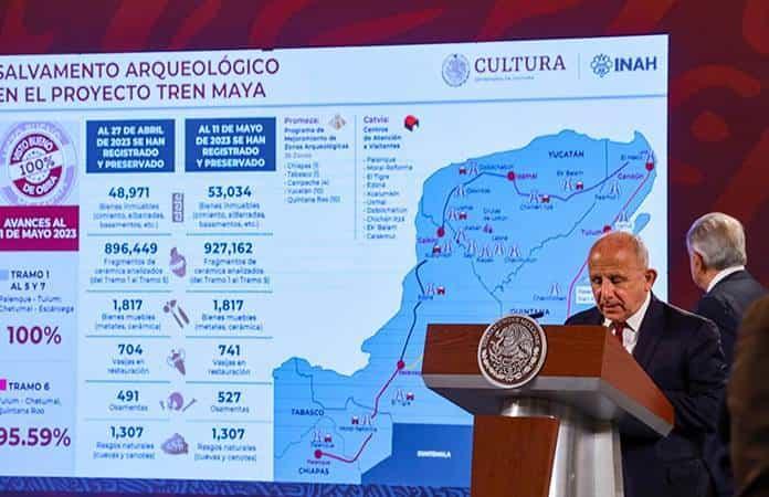 Dijo que a la fecha, en los siete tramos del Tren Maya se han registrado y recuperado 53 mil 034 bienes inmuebles, entre basamentos, zonas habitacionales, albarradas, caminos y otras estructuras de carácter inmueble; 927 mil 162 fragmentos de cerámica, que es "una cantidad inconmensurable que cada fragmento es información sobre la vida y las características de los grupos humanos en el área".