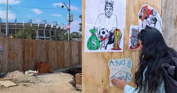 Durante la posada, las intervenciones comunitarias se convirtieron en una resistencia contra la Copa del Mundo. Mientras el ruido del tráfico de Tlalpan sonaba a lo lejos, los vecinos colocaron carteles con consignas que denunciaban el acaparamiento de agua al que sobreviven: desde "Juega contra el despojo" hasta "Agua para las casas, no para el Mundial".