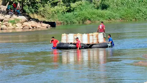 "No puedes tirar; no puedes tirar", dice un balsero cuando ve al marino con su fusil acercarse a la balsa. "Aquí estamos grabando". "Estamos en vivo", dice mientras uno de los marinos se acerca a la balsa cargada con varios bidones de gasolina para ser comercializada en territorio mexicano.