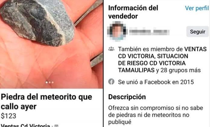 Restos del supuesto meteorito que impactó la noche del martes en una zona rural del ejido Lázaro Cárdenas en Tamaulipas, comenzaron a comercializarse en redes sociales. Con precios que oscilan entre 200 y 600 pesos por roca, usuarios de Facebook iniciaron la venta de estos supuestos restos que, aseguran, forman parte de la bola de fuego que aterrizó en este poblado.