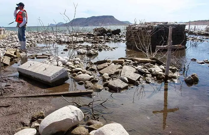 Hoy en día, la sequía ha puesto al descubierto la escuela, la iglesia y el panteón de esos pueblos inundados. También, se asoman esqueletos de árboles de álamo y palo fierro que quedaron sepultados y se resisten a fenecer.