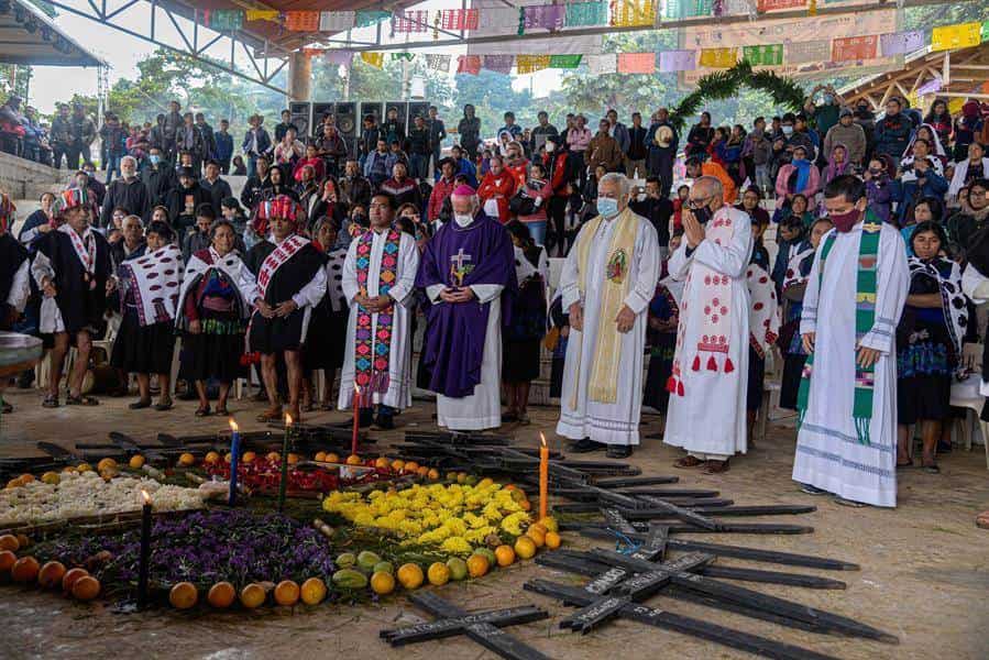 El obispo de la Diócesis de San Cristóbal de Las Casas, Rodrigo Aguilar Martínez, ofició la misa en memoria de las víctimas y los sobrevivientes, exhortando a los presentes a no "engancharse en el dolor y la ira".