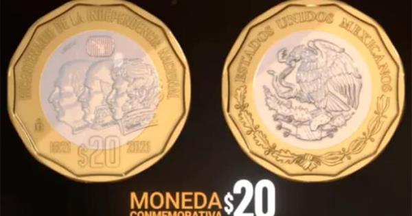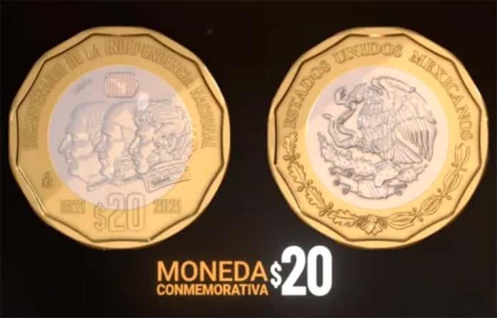 La moneda de 20 pesos que conmemora los 200 años de la consumación de la Independencia mexicana tiene al centro las efigies de Miguel Hidalgo, José María Morelos y Vicente Guerrero de perfil hacia la izquierda.