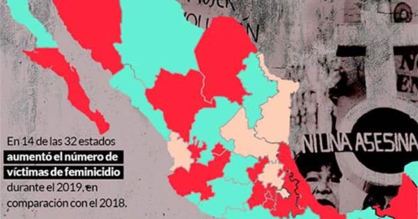 El incremento de feminicidios se presentó en 14 de los 32 estados; en tanto que, en cinco entidades, –Hidalgo, Nayarit, San Luis Potosí, Tamaulipas y Tlaxcala– la cifra de 2019 se mantiene exactamente igual que a la del año anterior.