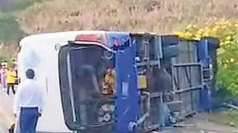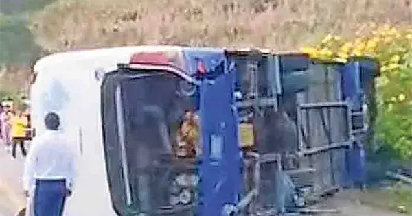 De acuerdo con los reportes preliminares, la volcadura fue ocasionada por fallas mecánicas en el sistema de frenos, así como por el estallido de una llanta trasera que provocó que el conductor perdiera el control de la unidad, quedando atravesado en la carretera.