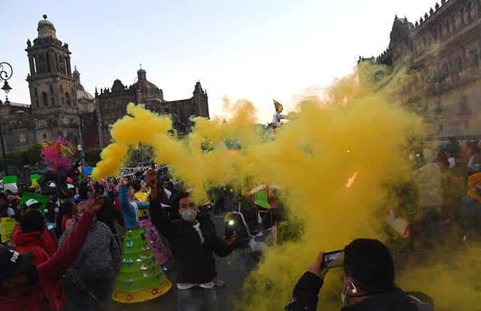 La jornada de protesta pirotécnica inició a las 6:30 horas frente a la puerta central de Palacio Nacional, donde detonaron cohetes, encendieron globos de cantoya y usaron bazucas pirotécnicas para llamar la atención del Ejecutivo, quien en el interior realizaba su conferencia mañanera.