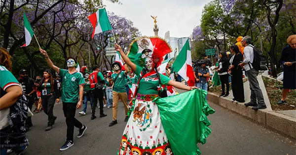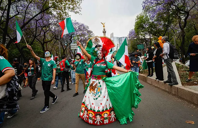 Ciudad de México.- A 80 días del inicio del Mundial en la Ciudad de México, catrines y catrinas tomaron durante tres horas Paseo de la Reforma y avenida Juárez para compartir la riqueza cultural y calentar el ánimo mundialista.