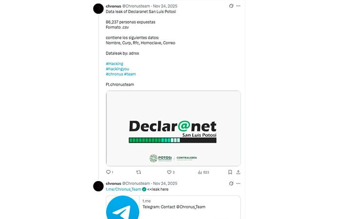 El 24 de noviembre, en la cuenta de X del grupo @Chronusteam se anunció una fuga del sistema Declaranet, a cargo de la Contraloría General del Estado, que contenía las declaraciones patrimoniales, de situación fiscal y de conflicto de interés de 86 mil 237 funcionarios estatales y municipales obligados a cumplir ese requisito.