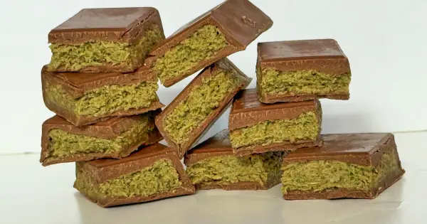 Retrocedamos un momento. La barra de chocolate original de Dubái, que ahora es un clásico, fue creada en 2021 por Fix Chocolatier en los Emiratos Árabes Unidos, y para 2023 explotó en las redes sociales. Rica y consentidora, presenta una gruesa capa de chocolate con leche que suele encerrar un relleno cremoso de pistacho (y a menudo, tahini) mezclado con crujientes trozos de pastel tipo filo llamado kadayif.