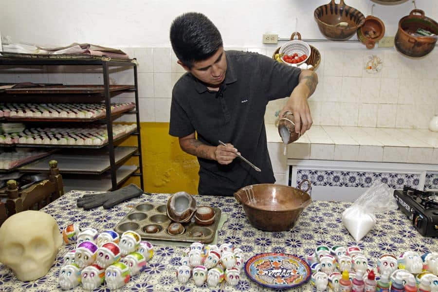 La colocación de esta figura, elaborada con productos básicos como azúcar, agua y colores vegetales, es una tradición que data de la época prehispánica y que sigue arraigada aunque desde hace décadas también se hacen con chocolate.