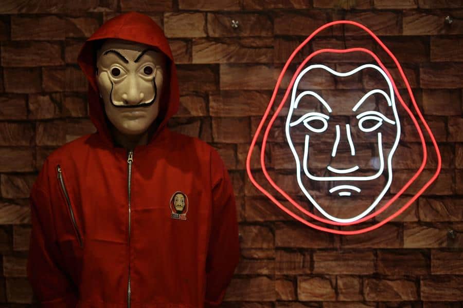 El propietario señaló que encargó los reconocibles monos rojos a un sastre local pero tuvo que importar las máscaras de Dubai, completando el uniforme de uno de los equipos de ladrones más famosos de la televisión con maletines negros en los que los camareros sirven los pedidos.