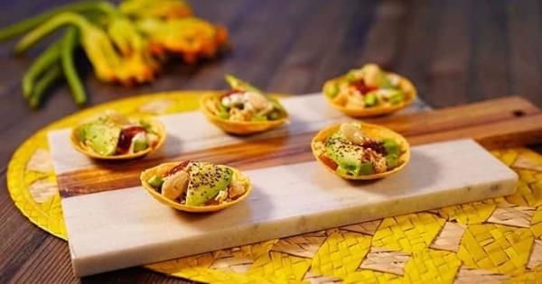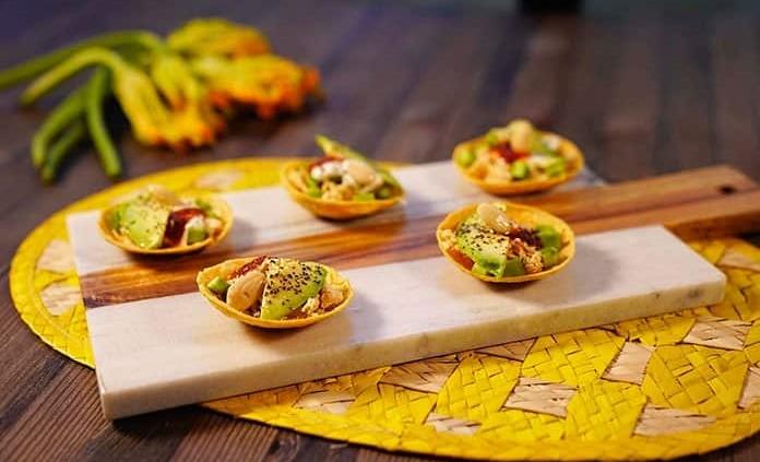 5. Montar en la chalupa el pollo desmenuzado, nopal, almendras, lechuga, chipotle.